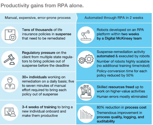 IPA接管了日常任務(wù),人類員工就可以被解放出來,從而專注于讓客戶滿意,并從其他的新數(shù)據(jù)中(如:新聞事件,社交媒體,嵌入式傳感器等)思考如何實(shí)現(xiàn)業(yè)務(wù)目標(biāo)。 雖然實(shí)施完整的IPA套件可帶來全方位的好處,但公司可以通過構(gòu)建單獨(dú)的項(xiàng)目快速得到重大收益。例如,單獨(dú)的RPA也可以顯著提高生產(chǎn)力,如下圖所示。