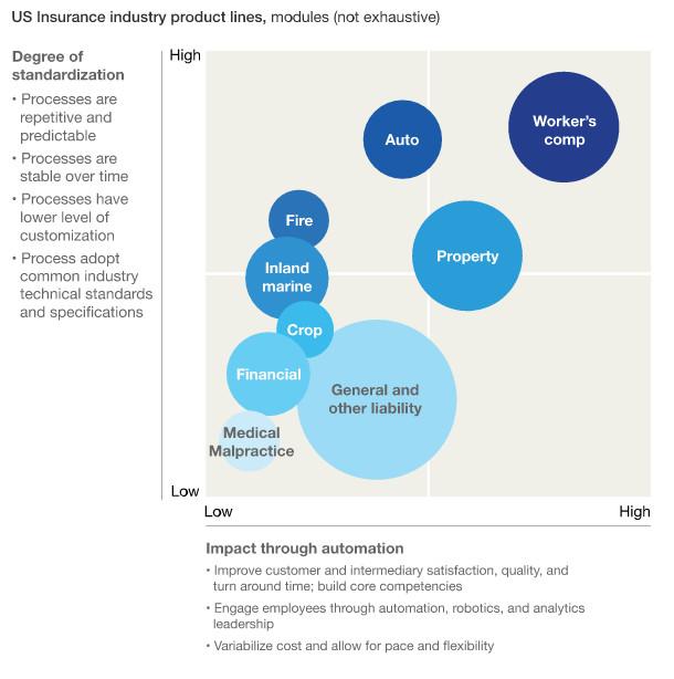 任何IPA應(yīng)用都是短期利益與更大的長期發(fā)展相結(jié)合的。應(yīng)該根植于對(duì)產(chǎn)品的特點(diǎn),與是否適合自動(dòng)化,來重新設(shè)計(jì)并構(gòu)建詳細(xì)的路線圖,并重新設(shè)想團(tuán)隊(duì)?wèi)?yīng)該以何種方式工作來創(chuàng)造價(jià)值。 例如,每個(gè)保險(xiǎn)產(chǎn)品線都有不同程度的標(biāo)準(zhǔn)化和自動(dòng)化潛力,需要對(duì)他們進(jìn)行考察(如圖2)。一些時(shí)間密集型工作例如銷售,承保和定價(jià),政策管理,索賠和財(cái)務(wù)等,就很適合使用IPA,當(dāng)決定這些工作未來都如何進(jìn)行之后,就從頭開始構(gòu)建。